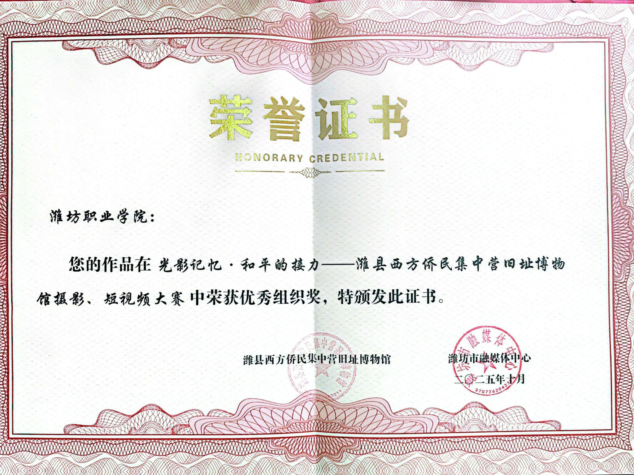 10月24日上午,“光影记忆·和平的接力”——潍县西方侨民集中营旧址博物馆摄影、短视频大赛颁奖典礼在潍坊市广电大厦一楼隆重举行。在此次大赛中,由我院国际学生马康、周芳欣参与录制的《和平之愿 跨越山海》视频作品荣获一等奖,学院获评优秀组织奖。