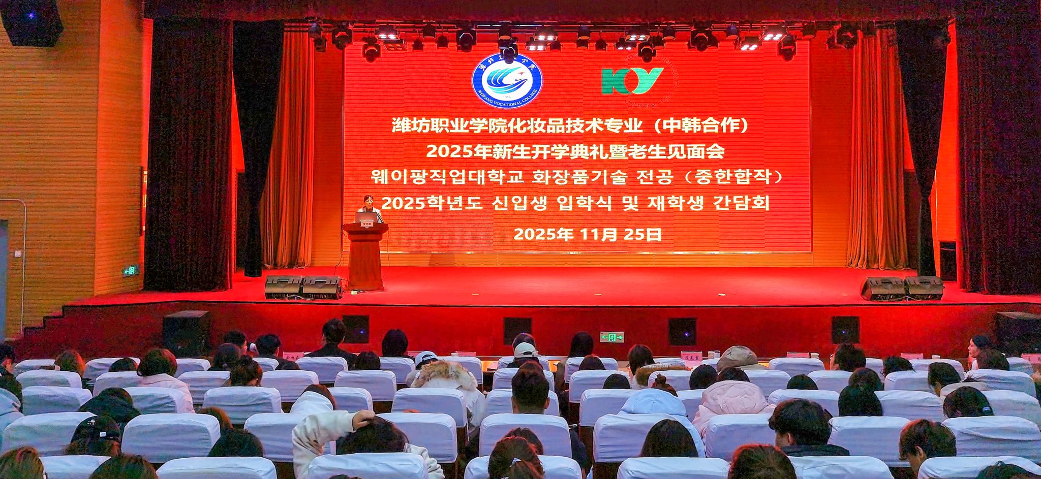11月25日下午,化学工程学院化妆品技术(中韩合作)专业2025级新生开学典礼暨老生见面会在滨海校区图书馆报告厅举行。韩国建阳大学校长金容夏一行5人参加见面会,学院副院长陈美霞陪同,国际交流与合作处骨干教师、化学工程学院在校生及班主任共180余人齐聚一堂,共同见证这一重要时刻。活动由化学工程学院教学负责同志主持。
