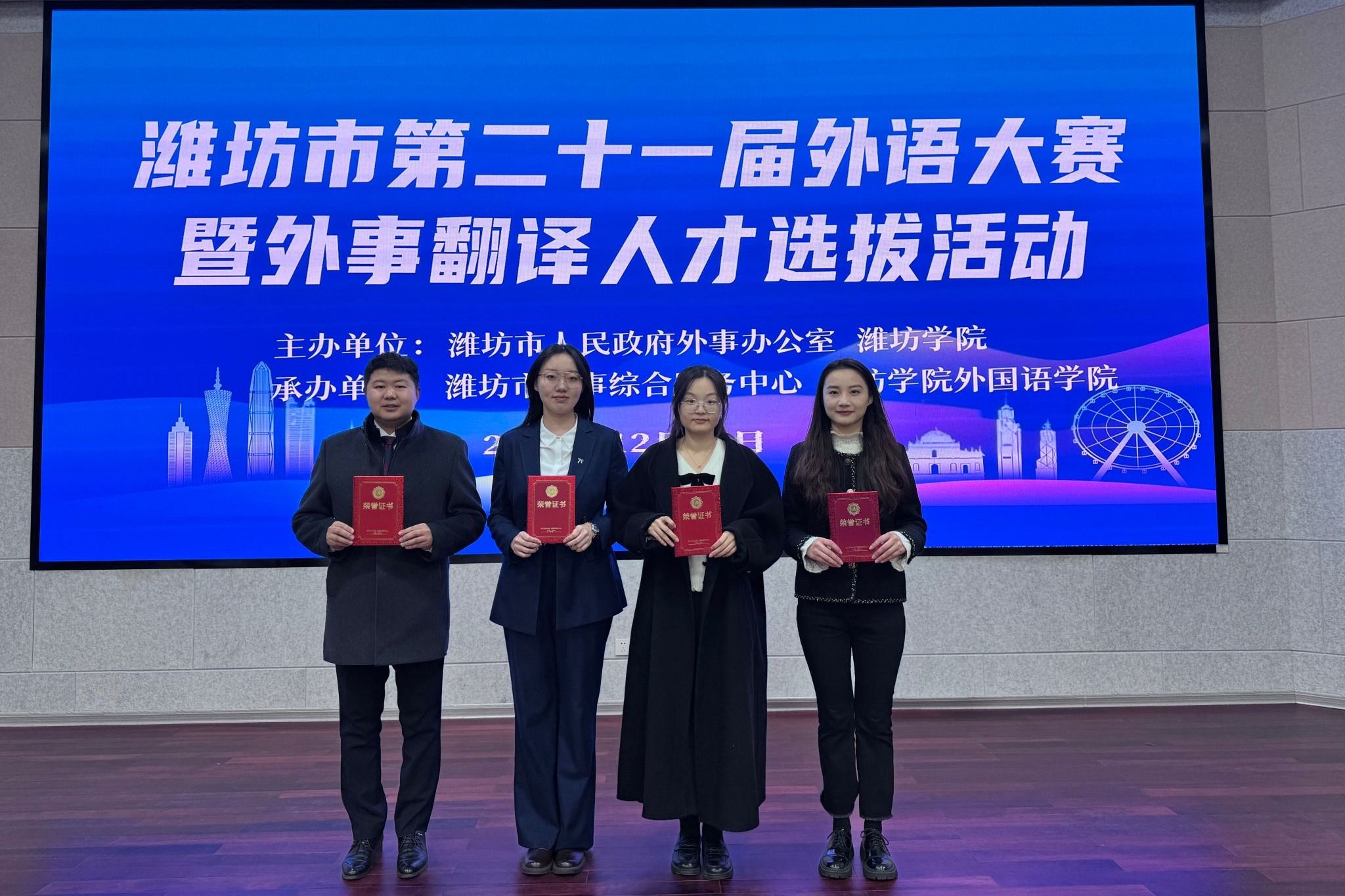 本次大赛由潍坊市人民政府外事办公室和潍坊学院主办,旨在为我市“万亿城市”建设目标提供外语人才支撑,服务对外交流、招商引资与重大外事活动。来自市直部门、各县市区外事部门、高校等单位的选手参与角逐。我院组织人事处教师张语熹获多语种组二等奖,国际交流与合作处教师肖瑶、化学工程学院教师乔彦霖获多语种组三等奖,国际交流与合作处教师王慧获英语组优胜奖,展现了我院教师出色的外语素养与综合表达能力。