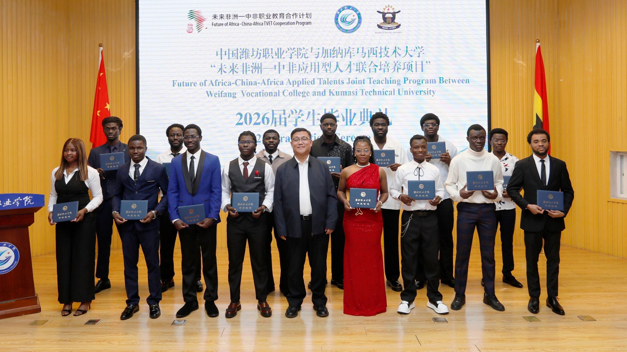 卢杰向全体毕业生表示祝贺,并向两校教职员工的辛勤付出致以崇高敬意。她指出,“未来非洲”项目是潍坊市与友城库马西市深化教育合作、促进民心相通的重要成果,充分肯定了潍坊职业学院作为首批试点院校所发挥的积极作用。她希望学院继续优化人才培养模式,打造可推广的“潍坊经验”,并期待两校以毕业生为纽带,推动合作向更广领域、更高层次迈进,为深化中非友好、培养高素质技术技能人才提供可持续的合作范式。