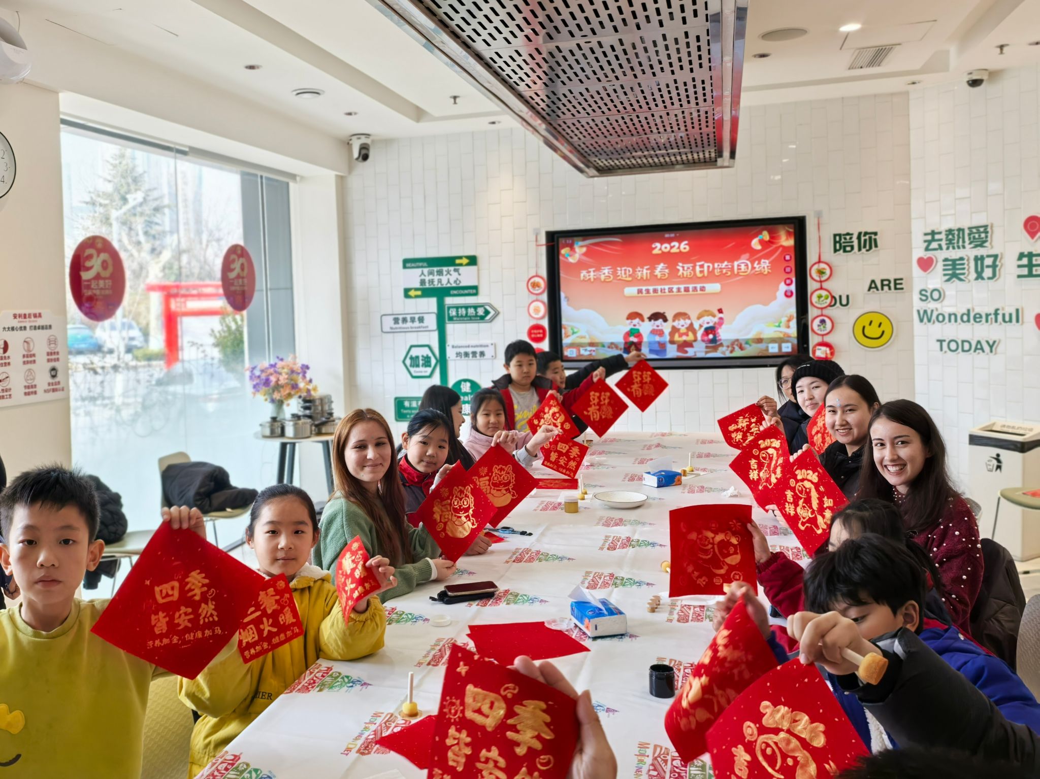 活动中,烘焙老师逐步讲解并演示了雪花酥的制作流程。学生们在老师指导下亲手操作,一步步完成属于自己的甜蜜作品。拓印环节,大家在老师的带领下铺纸、拓印,专注体验每一道工序,在红纸上印下一个个祝福语。整个活动现场,中外语言交汇,笑语不断,洋溢着喜乐融融、友好交融的温暖氛围。